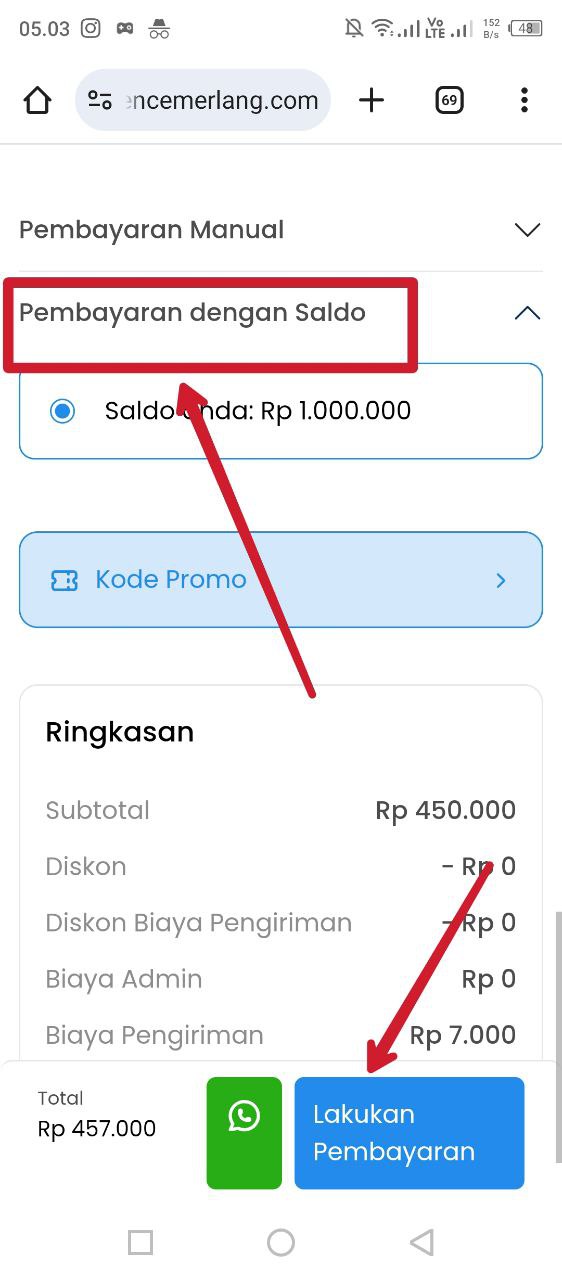 - Silahkan pilih pembayaran manual, kalau yang sudah punya saldo pilih pembayaran dengan saldo, klik lakukan pembayaran